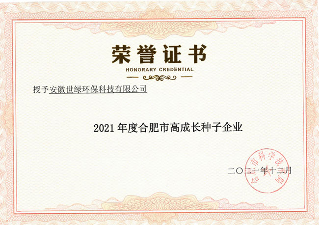 2021年合肥市高成長企業(yè)認(rèn)定結(jié)果正式出爐啦!近日,合肥市科技局委托各區(qū)管委會(huì),對認(rèn)定企業(yè)發(fā)放了認(rèn)定證書。安徽世綠環(huán)保榮獲2021年合肥市高成長種子企業(yè)。